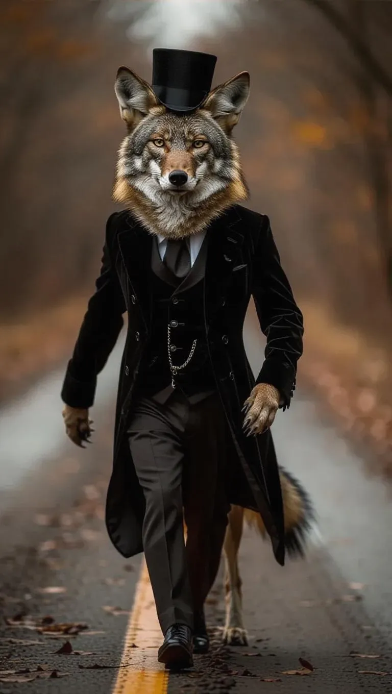 A wily coyote casually strolls down the road with a sly grin. It sports a fancy, black velvet jacket and a top hat, reminiscent of a gentleman. The coyote's slender tail follows its steps, adding charisma.