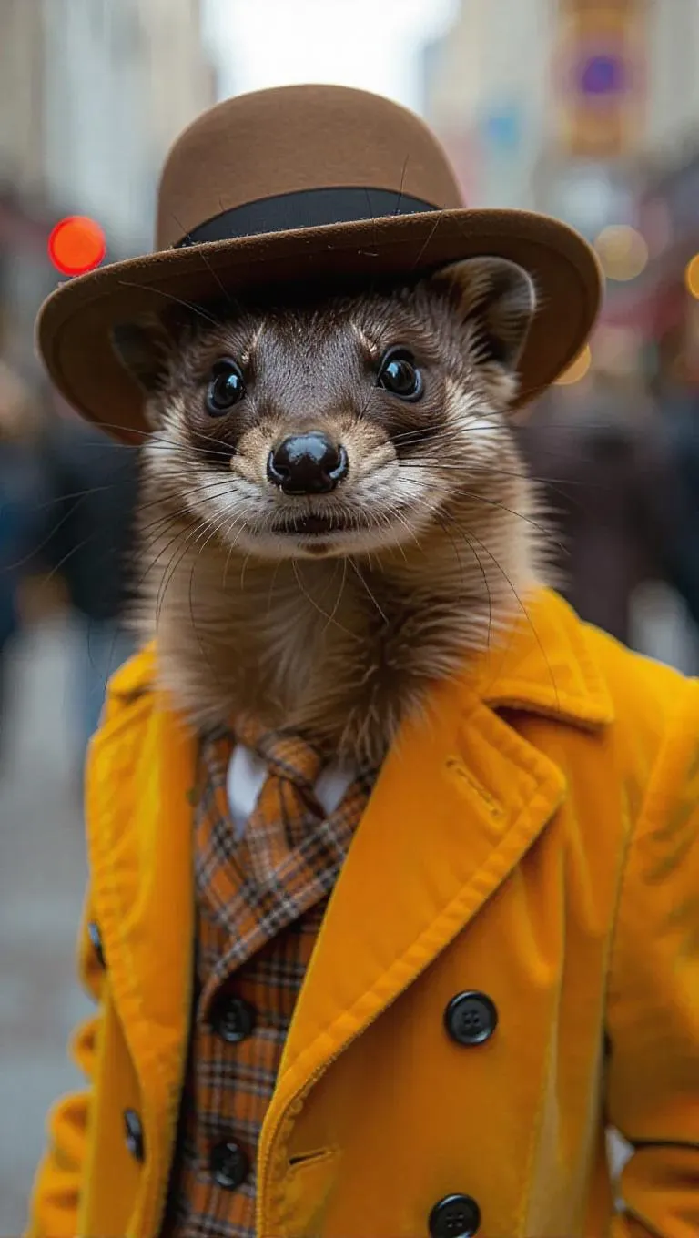 A crafty weasel slyly sneaks down the boulevard with an impish expression. It wears a jazzy, yellow velvet jacket and a boater hat, giving it a trendy vibe. The weasel's nimble tail dances as it moves, boosting its charm.