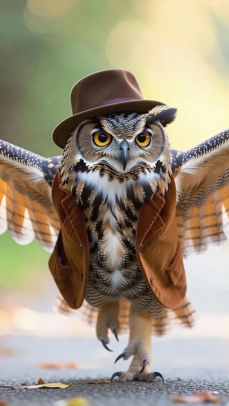 A clever owl glides down the path with a knowing look. It dons a charming, brown velvet jacket and a small hat, exuding sophistication. The owl's wide wings spread gently as it moves, enhancing its presence.