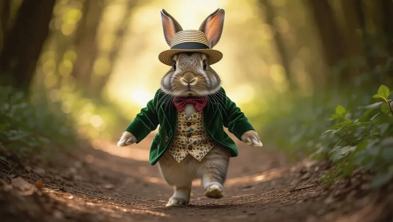 A cunning rabbit hops down the trail with a playful glance. It’s adorned in a bright green velvet jacket and a tiny straw hat, giving it a charming appearance. The rabbit's ears flap joyfully as it hops, enhancing its cute demeanor.