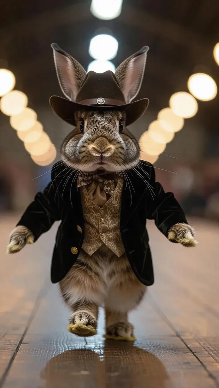 A crafty rabbit cleverly makes its way down the runway with a playful grin. It wears a shiny, black velvet jacket and a small cowboy hat, giving it a dapper look. The rabbit's long ears perk up as it walks, adding to its charm.