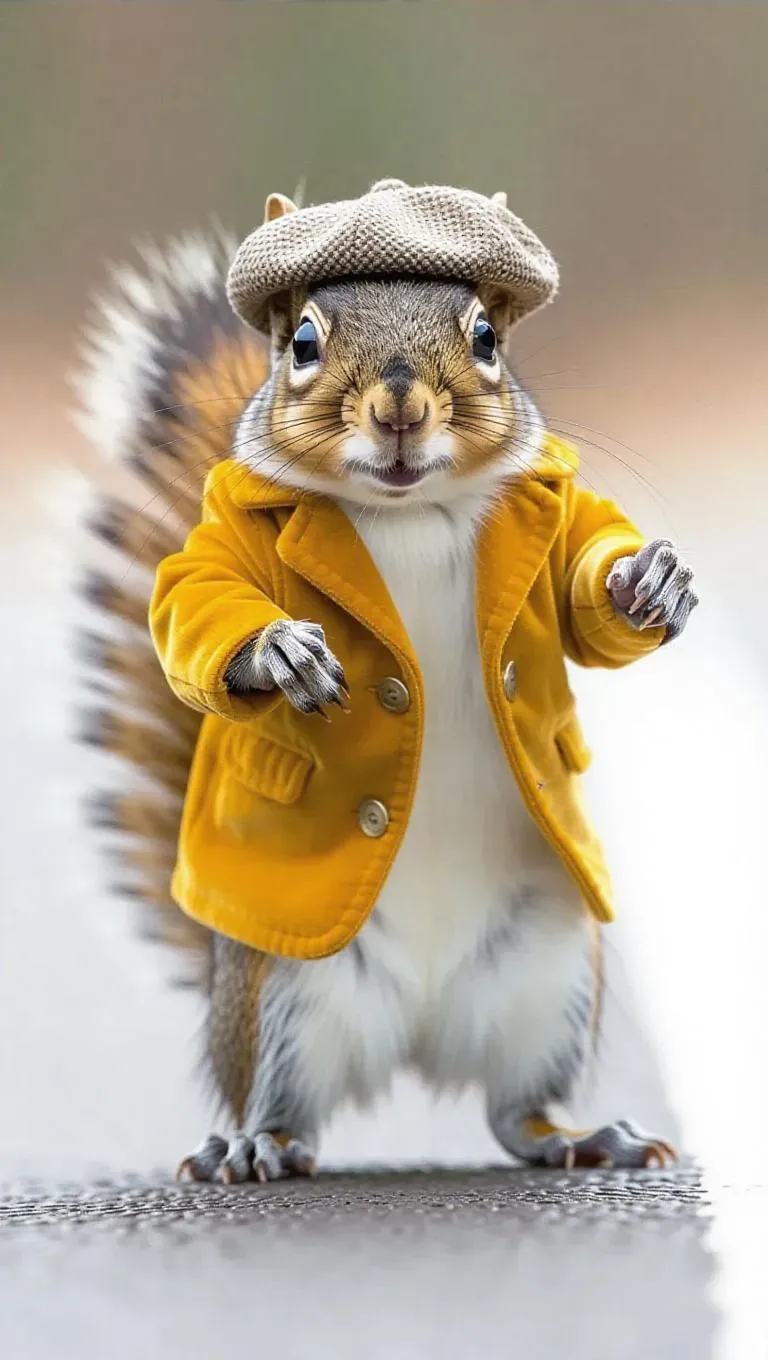 A wily squirrel nimbly makes its way down the runway with an impish smile. It wears a chic, yellow velvet jacket and a small beret, giving it a dapper look. The squirrel's fluffy tail sways as it hops, adding to its charm.