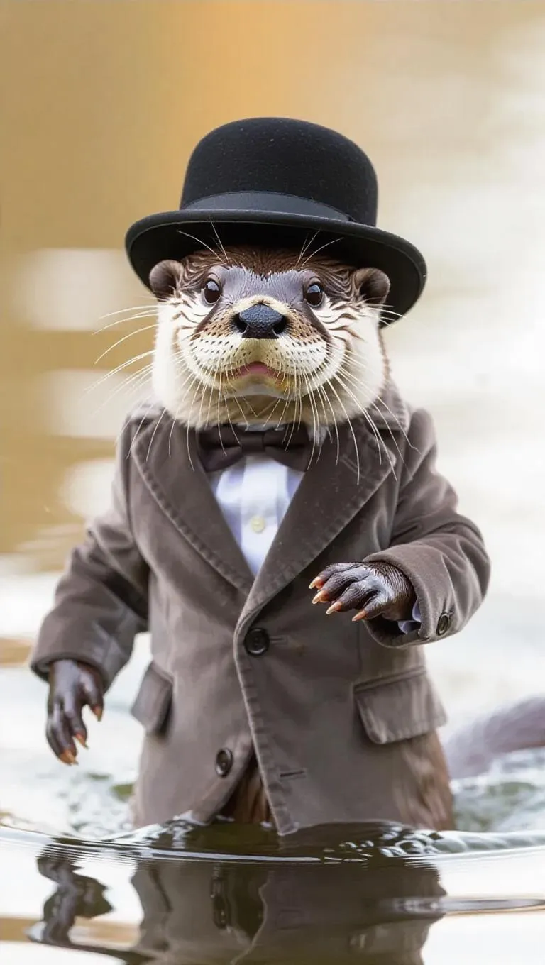 A clever otter playfully makes its way down the runway with a beaming smile. It wears a sophisticated, gray velvet jacket and a tiny bowler hat, giving it a dapper look. The otter's sleek tail glides as it swims, adding to its charm.