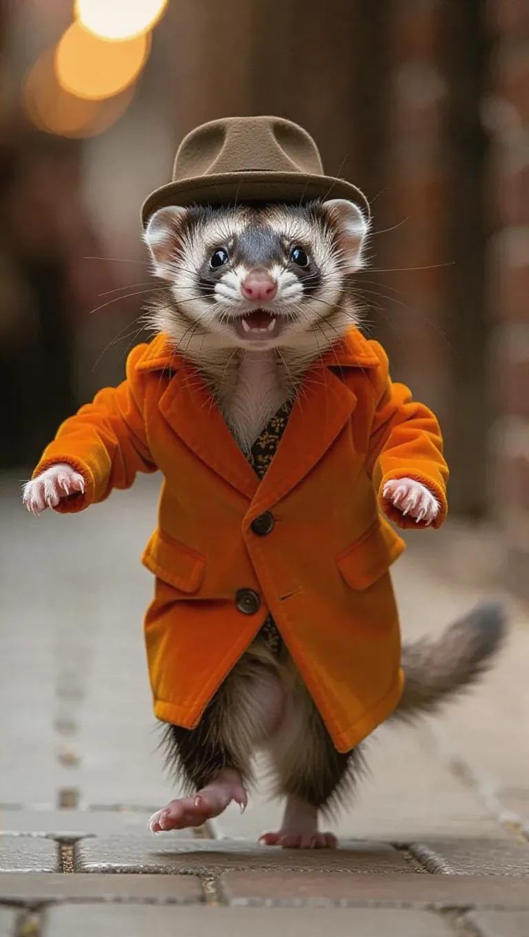 A whimsical ferret happily makes its way down the runway with a radiant smile. It wears a whimsical, orange velvet jacket and a small fedora, giving it a dapper look. The ferret's tail wags excitedly as it runs, adding to its charm.
