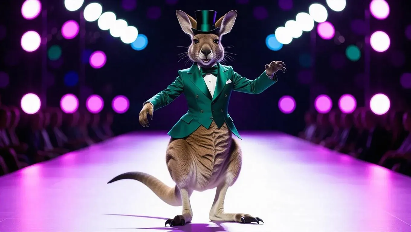 A shrewd kangaroo proudly makes its way down the runway with a confident smile. It wears a sleek, emerald green jacket and a tiny top hat, giving it a dapper look. The kangaroo's tail thumps rhythmically as it hops, adding to its charm.