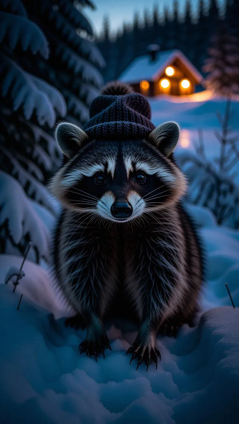 A curious raccoon wanders through the snowy landscapes of Lapland, Finland, its paws crunching in the fresh snow. The raccoon wears a thick fur coat and a hat perched on its head, its breath visible in the cold air. Behind it, snow-covered trees and frozen lakes stretch out, their surfaces glistening in the moonlight. In the distance, a small cabin sits on the edge of the forest, its windows glowing warmly. The air is crisp and filled with the scent of cedar trees.
