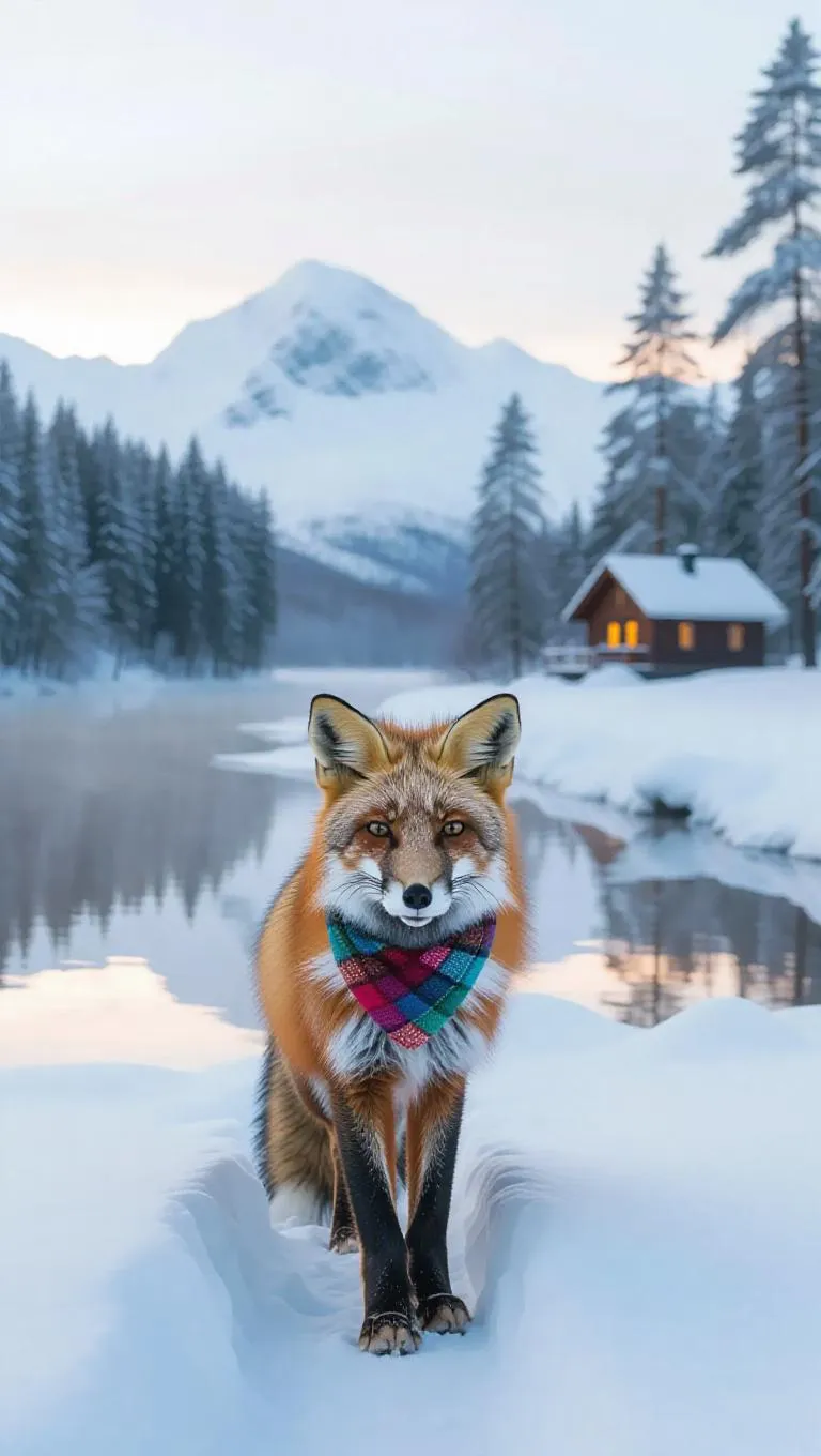 A curious fox wanders through the snowy landscapes of Lapland, Finland, its paws crunching in the fresh snow. The fox wears a stylish fur coat and a colorful scarf, its breath visible in the cold air. Behind it, snow-covered mountains and frozen rivers stretch out, their surfaces glistening in the afternoon sunlight. In the distance, a cozy lodge sits on the edge of the forest, its windows flickering with light. The air is crisp and filled with the scent of baked goods.