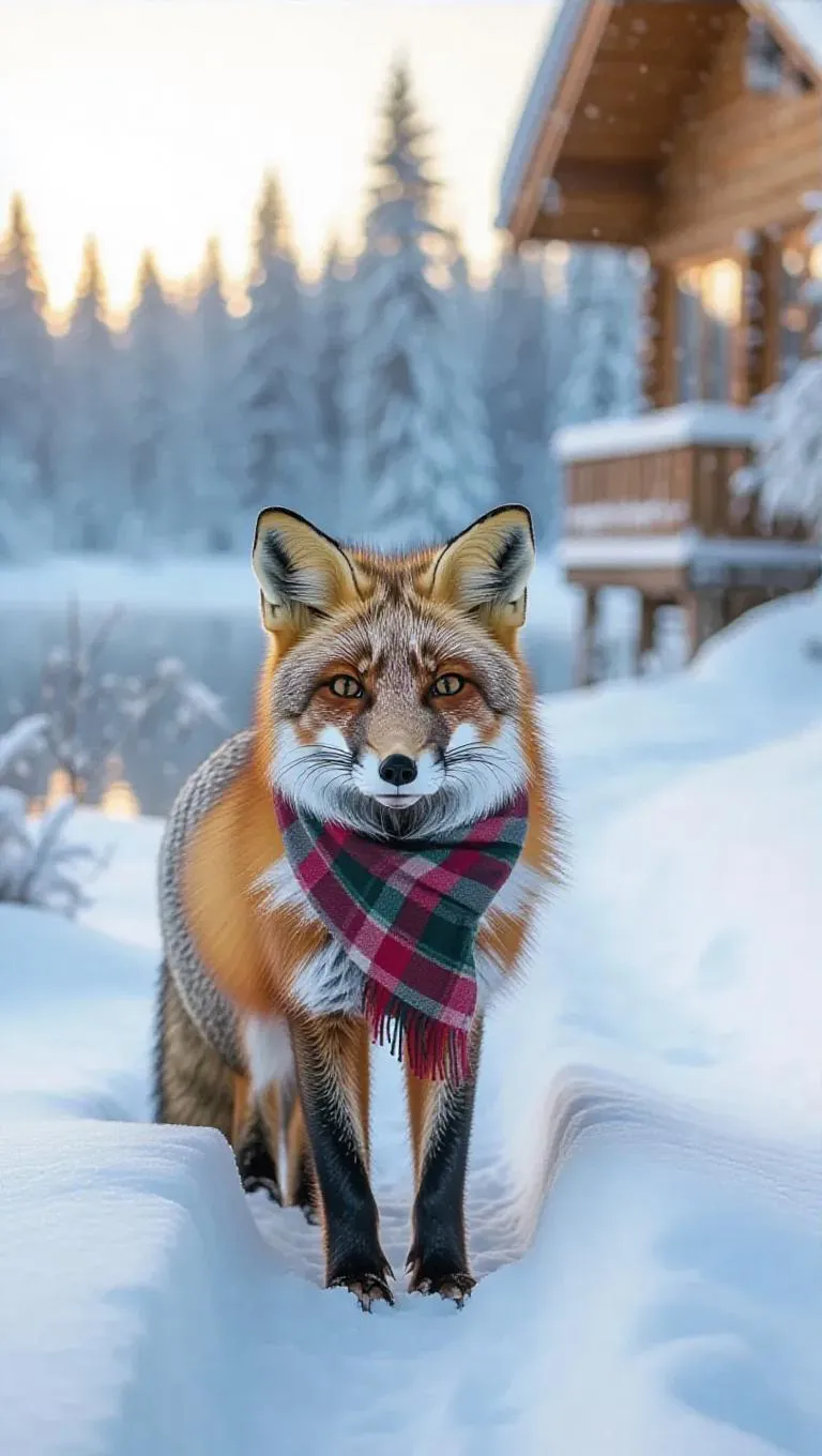 A curious fox wanders through the snowy landscapes of Lapland, Finland, its paws crunching in the fresh snow. The fox wears a thick fur coat and a plaid scarf, its breath visible in the cold air. Behind it, snow-covered trees and a serene lake stretch out, their surfaces shimmering in the morning sun. In the distance, a lively cabin sits on the edge of the forest, its porch decorated for the holidays. The air is crisp and filled with the scent of cinnamon.
