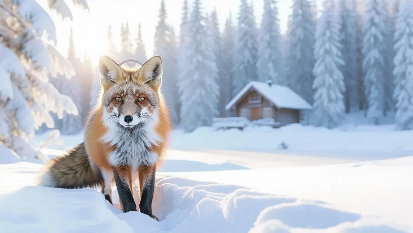 A curious fox roams through the snowy forests of Lapland, Finland, its paws crunching in the fresh snow. The fox is wrapped in a thick fur coat paired with stylish earmuffs, its breath visible amidst the chill. Behind it, tall pines blanketed in snow and a silver-glazed lake stretch out, shimmering in the sunlit tranquility. In the distance, a picturesque cabin appears at the forest's edge, its warm glow inviting and welcoming. The air is crisp, infused with pine's aromatic notes.
