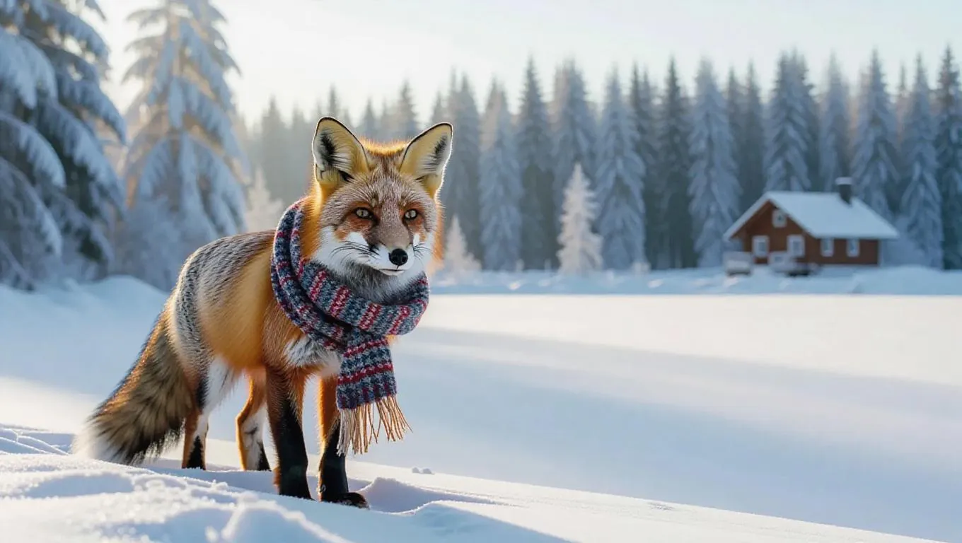 A curious fox wanders through the icy realms of Lapland, Finland, its paws making soft crunching sounds in the fresh snow. The fox is dressed in a thick fur coat accented by a playful scarf, its breath visible like tiny clouds in the icy atmosphere. Behind it, snow-laden evergreens and a sparkling frozen pond extend to the horizon, shimmering in the sunlight. In the distance, a cozy chalet resides quietly at the edge of the forest, its chimney puffing out gentle smoke. The air is fresh and filled with the scent of pine and snow.