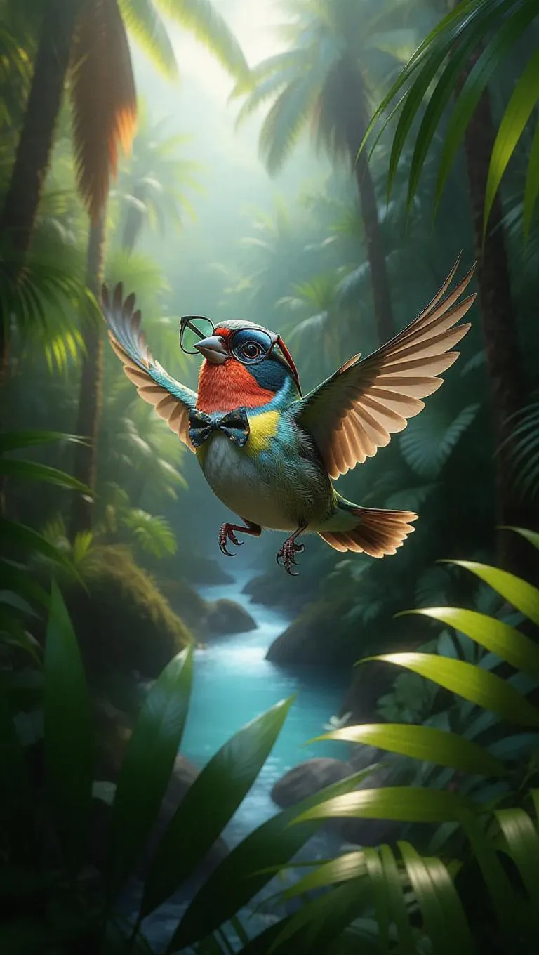 An exuberant finch darts through the leafy jungles of Costa Rica, its diverse colors sparkling under the midday sun. The finch dons a small bowtie and a pair of retro glasses, its wings fluttering with excitement. All around it, thick jungle shrubs and towering palms reach high, their leaves vibrant with life. Far off, a dazzling creek winds its way into a serene pond, its waters a bright azure contrasting with the lively greenery. The fragrance of fresh soil and tropical greenery fills the air.