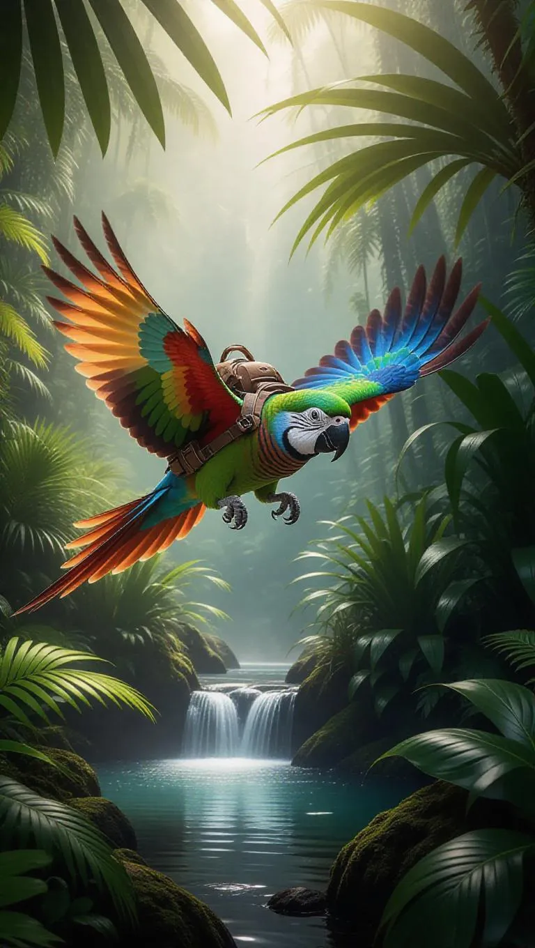 A spirited parakeet zooms across the rich rainforests of Costa Rica, its multicolored feathers shining brightly in the daylight. The parakeet is adorned with a miniature backpack and stylish sunglasses, its wings beating energetically. Surrounding it, flourishing young trees and massive ferns spread out, their surfaces teeming with vitality. In the background, a gentle stream flows into a misty deluge, its waters a lovely cerulean amongst the foliage. The atmosphere is imbued with the fragrance of earthiness and blooming tropical plants.
