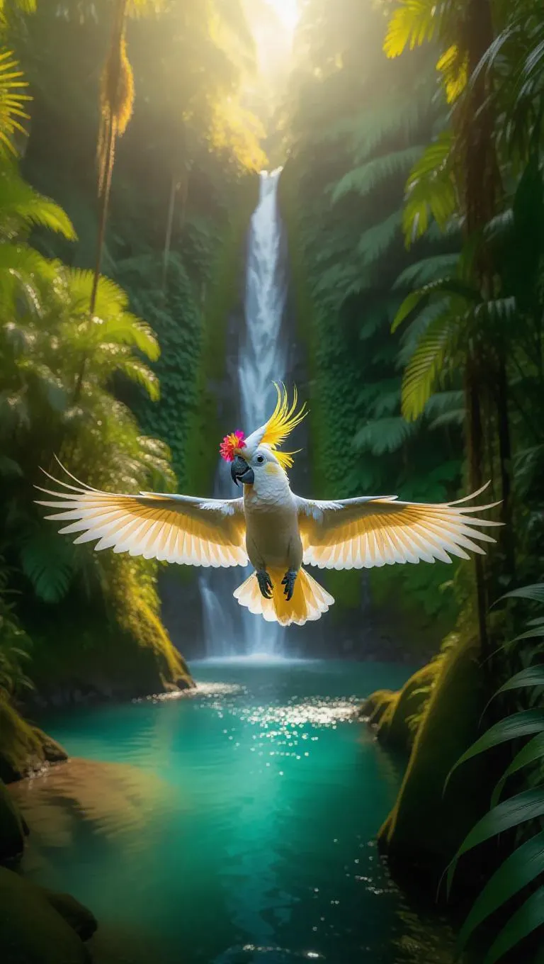 A vibrant cockatoo glides through the lush greenery of Costa Rica's rainforests, its stunning feathers radiant in the glow of the sun. The cockatoo wears a bright flower crown and tiny flip-flops, its wings stretching with vigor. Around it, lush greenery and towering emerald trees dominate the scene, their surfaces rich with life. In the distance, a majestic waterfall tumbles into a sparkling pool, its waters a dazzling aquamarine against the green. The air carries the scent of damp earth and fragrant blossoms.