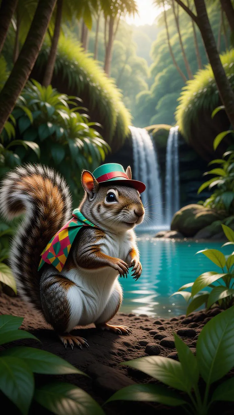 A carefree squirrel glances through the dense forests of Costa Rica, its bushy tail flickering in the warm sun. The squirrel sports a colorful cape and a whimsical hat, its movements brisk and lively. Nearby, thick shrubs and majestic trees tower high, their trunks covered in greenery. In the background, a small brook flows into a tranquil pool, its waters a vivid blue contrasting with the rich foliage. The air is thick with the scent of rich earth and tropical aromas.