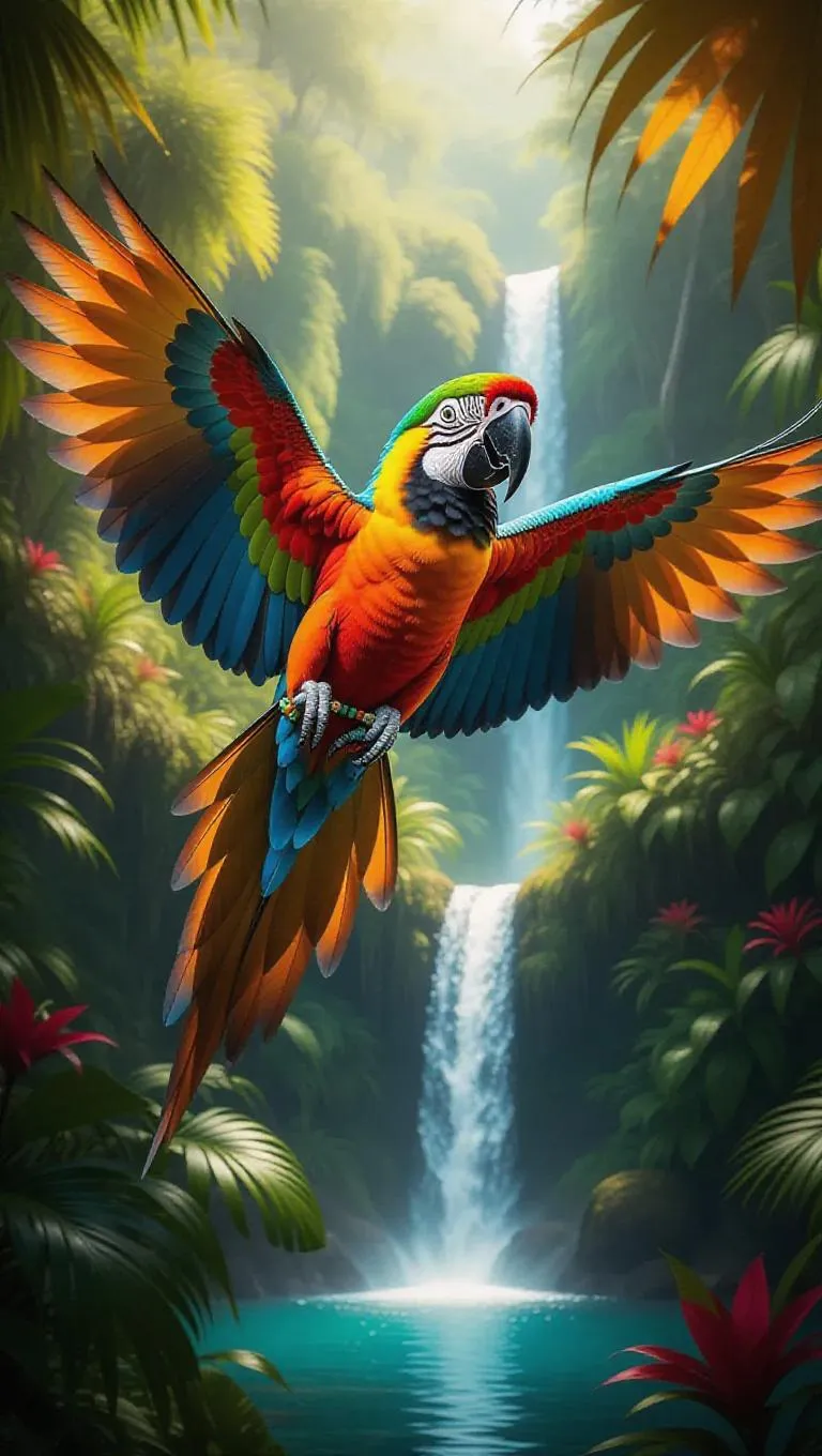 An energetic macaw swoops through the colorful rainforests of Costa Rica, its feathers flashing brilliantly in the sun. The macaw is accessorized with a funky headband and bright beaded bracelets, its wings moving with vigor. Surrounding it, dense leaves and towering trunks create a vibrant jungle scene, their surfaces teeming with life. Far off, a radiant waterfall cascades into a crystalline pool, its waters a vivid blue amidst the greenery. The atmosphere is bursting with the aroma of earth and cheerful blossoms.