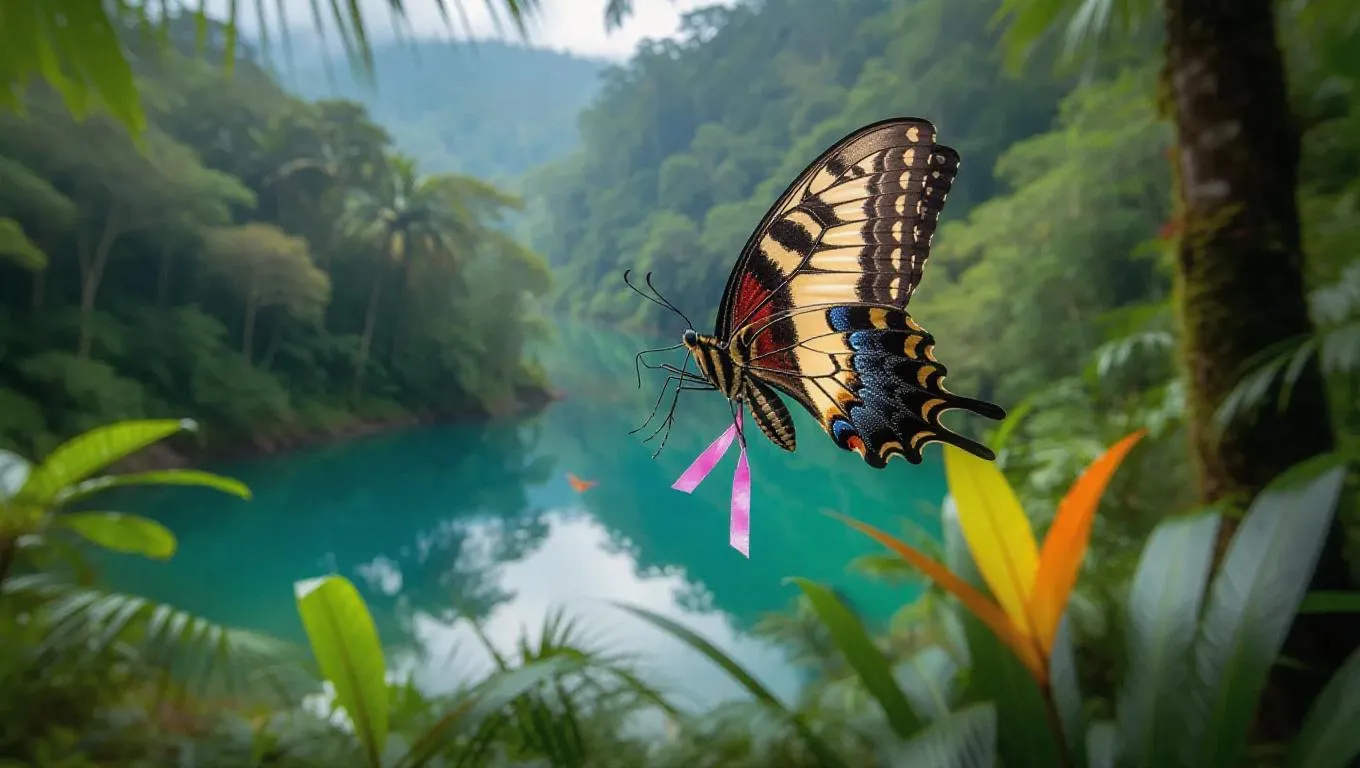 A charming butterfly dances through the colorful rainforests of Costa Rica, its dazzling wings fluttering in the sun. The butterfly is adorned with tiny beads and a delicate ribbon, its movements graceful and lively. Surrounding it, lush vegetation and towering trees form a vibrant environment, their surfaces teeming with life. Off in the distance, a tranquil lake glimmers under the sun, its waters a brilliant blue amidst the greenery. The air is suffused with the scents of damp earth and fragrant flowers.