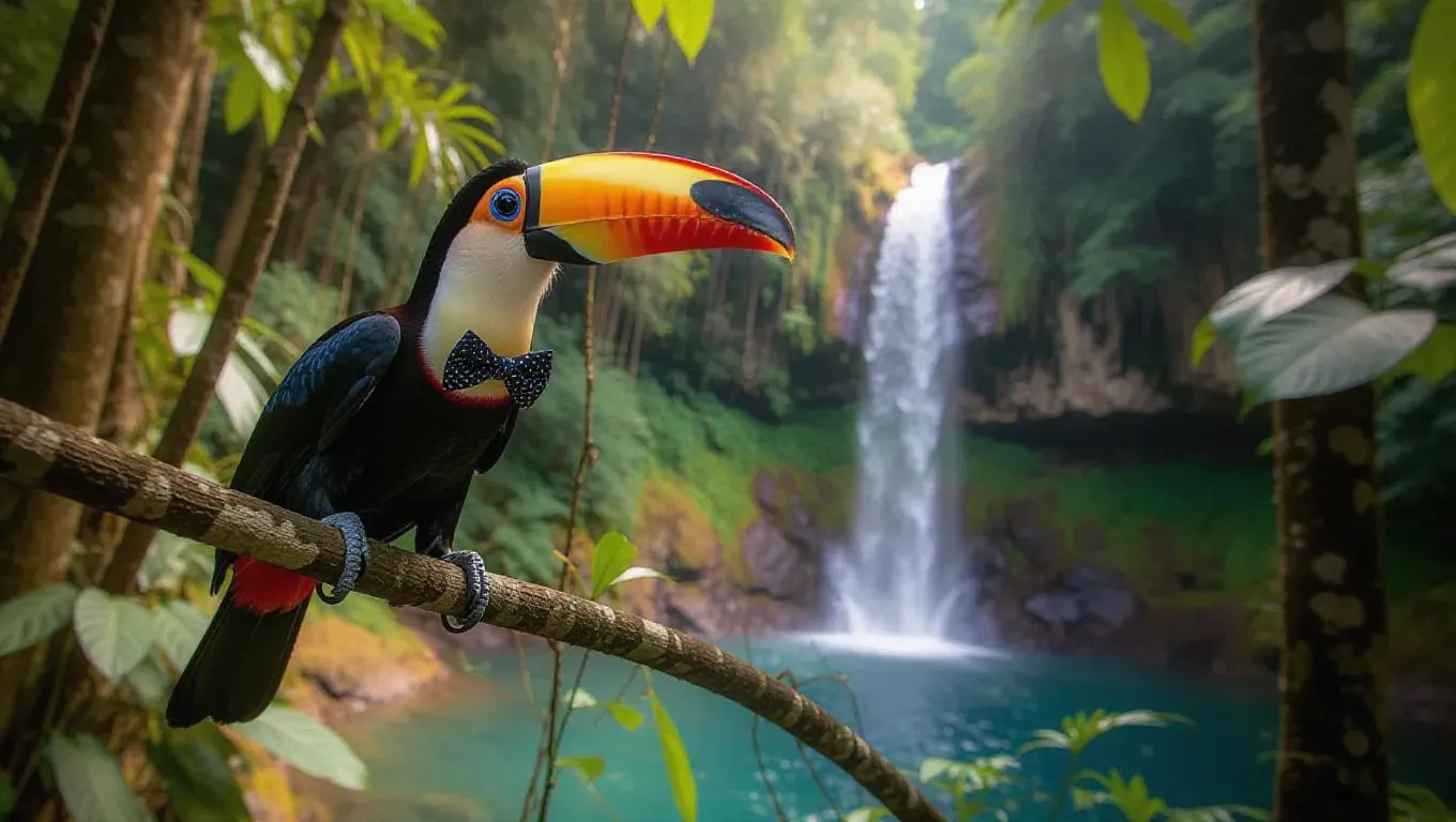 A lively toucan hops from branch to branch in the vibrant jungles of Costa Rica, its bright plumage glowing in the sunlight. The toucan is accessorized with a stylish bowtie and a pair of sunshades, its wings poised for action. Surrounding it are thick vines and towering trees, their trunks heavily laden with leaves. Off in the distance, a majestic waterfall tumbles into a crystalline pool, its waters a stunning turquoise against the lush environment. The air is filled with the fragrance of fertile soil and tropical flowers.