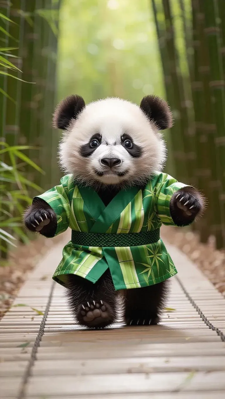 A cute panda waddles down the runway, looking adorable and playful. It wears a stylish bamboo-themed outfit with green accents. The background is a serene bamboo forest with soft lighting, creating a tranquil atmosphere