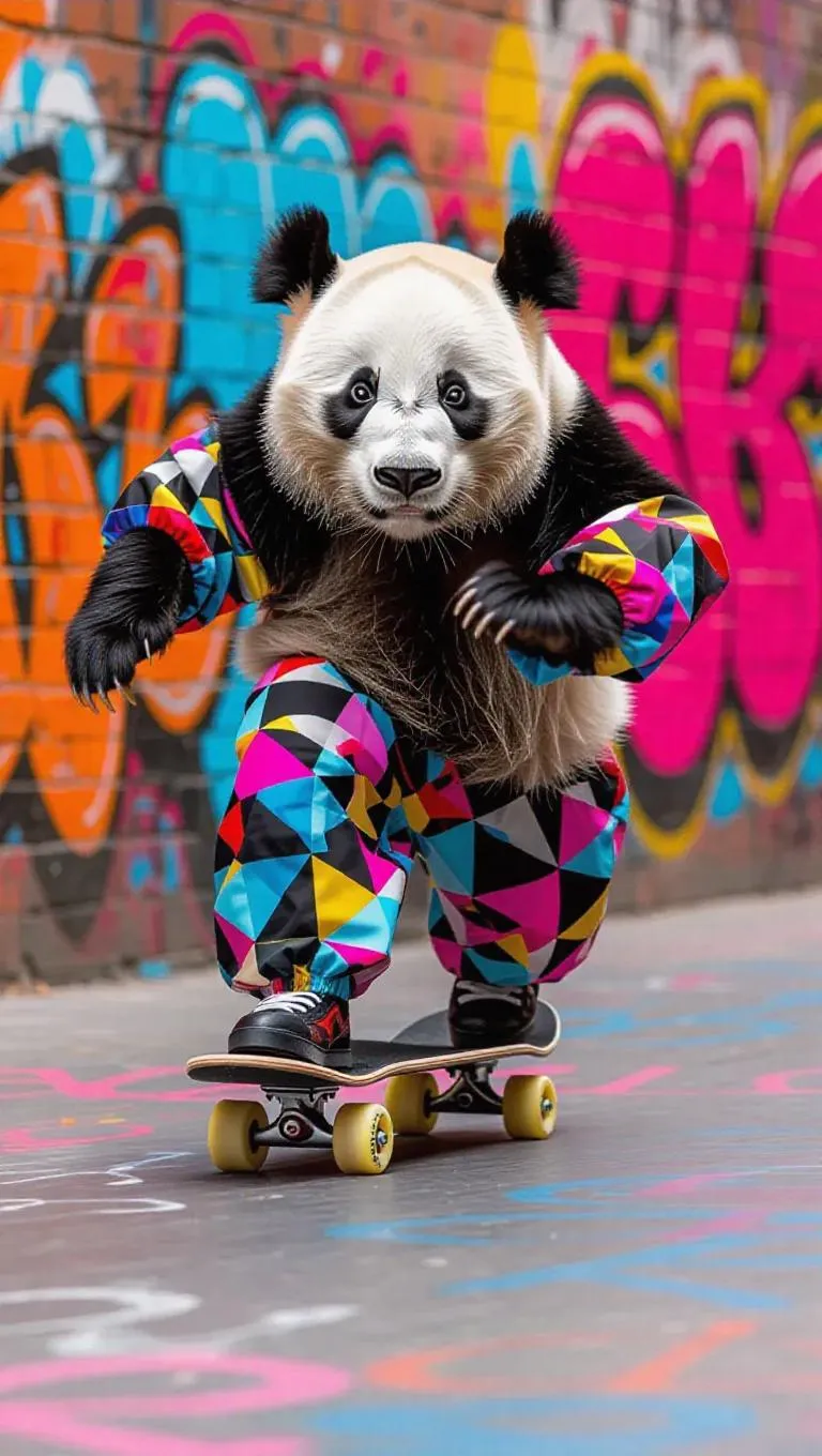 A trendy panda skates smoothly down an urban runway, embodying coolness and flair. It sports a funky streetwear outfit with bold geometric patterns. The background is a graffiti-covered wall in a lively neighborhood, creating a vibrant atmosphere.
