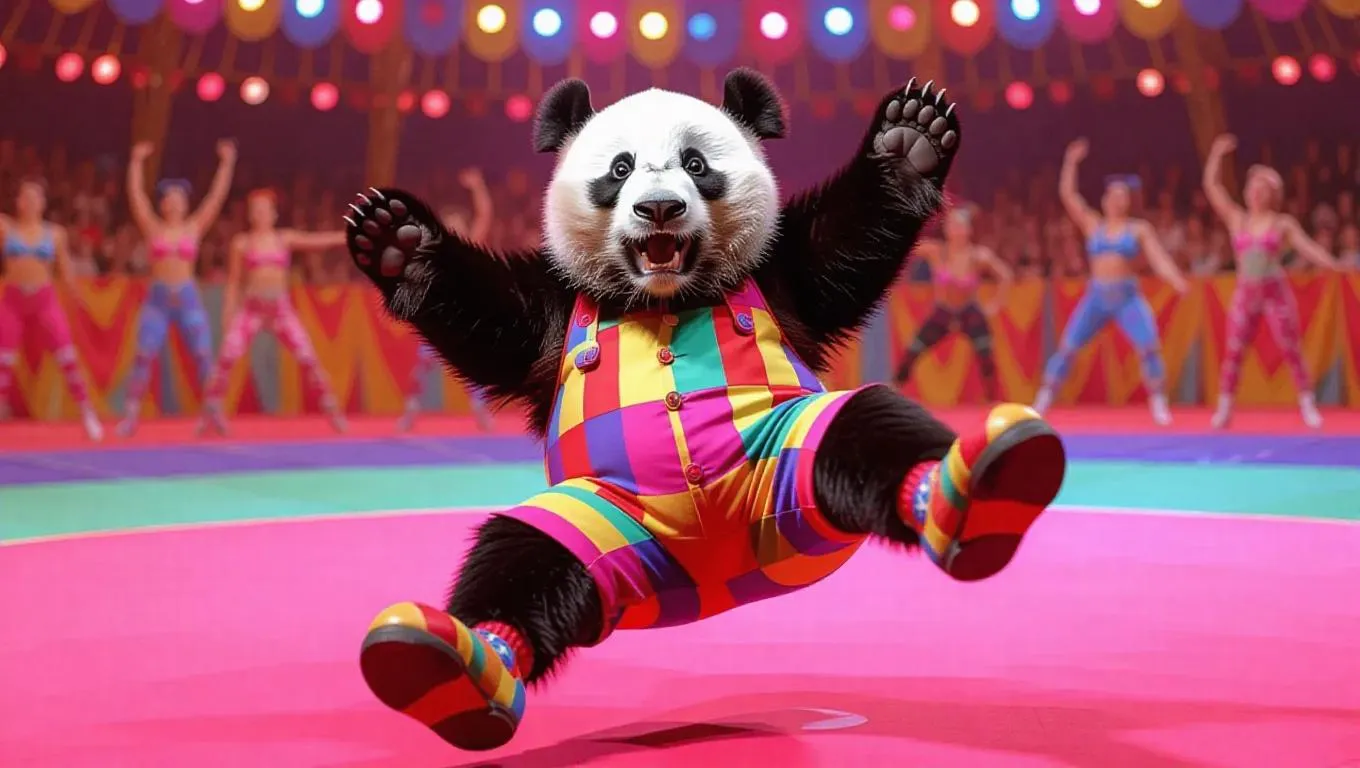 A hilarious panda cartwheels joyfully down a circus runway, exuding fun and laughter. It wears a clown suit with oversized shoes. The background is a circus ring with acrobats performing, creating a lively atmosphere.