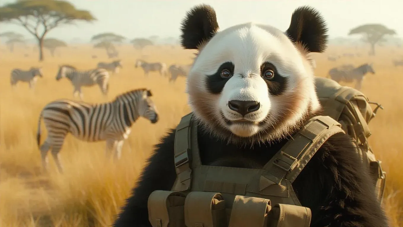 An adventurous panda explores a safari runway, looking inquisitive and excited. It is dressed in an explorer outfit with utility pockets. The background features a vast savannah with wild animals roaming, creating a thrilling atmosphere.