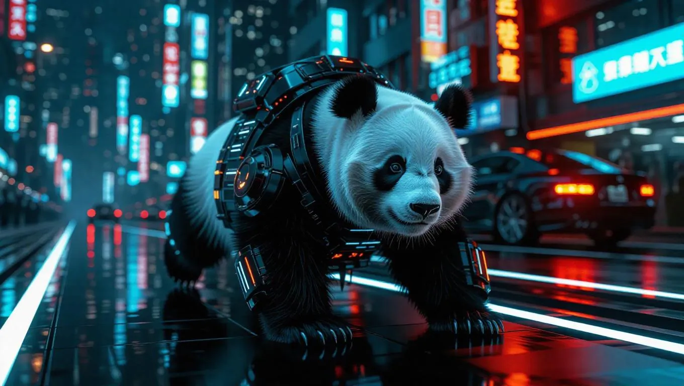 A futuristic panda glides down a sci-fi runway, showcasing innovation and style. It wears a cyberpunk outfit with neon wires. The background features a cityscape at night with flying cars, creating a high-tech atmosphere.