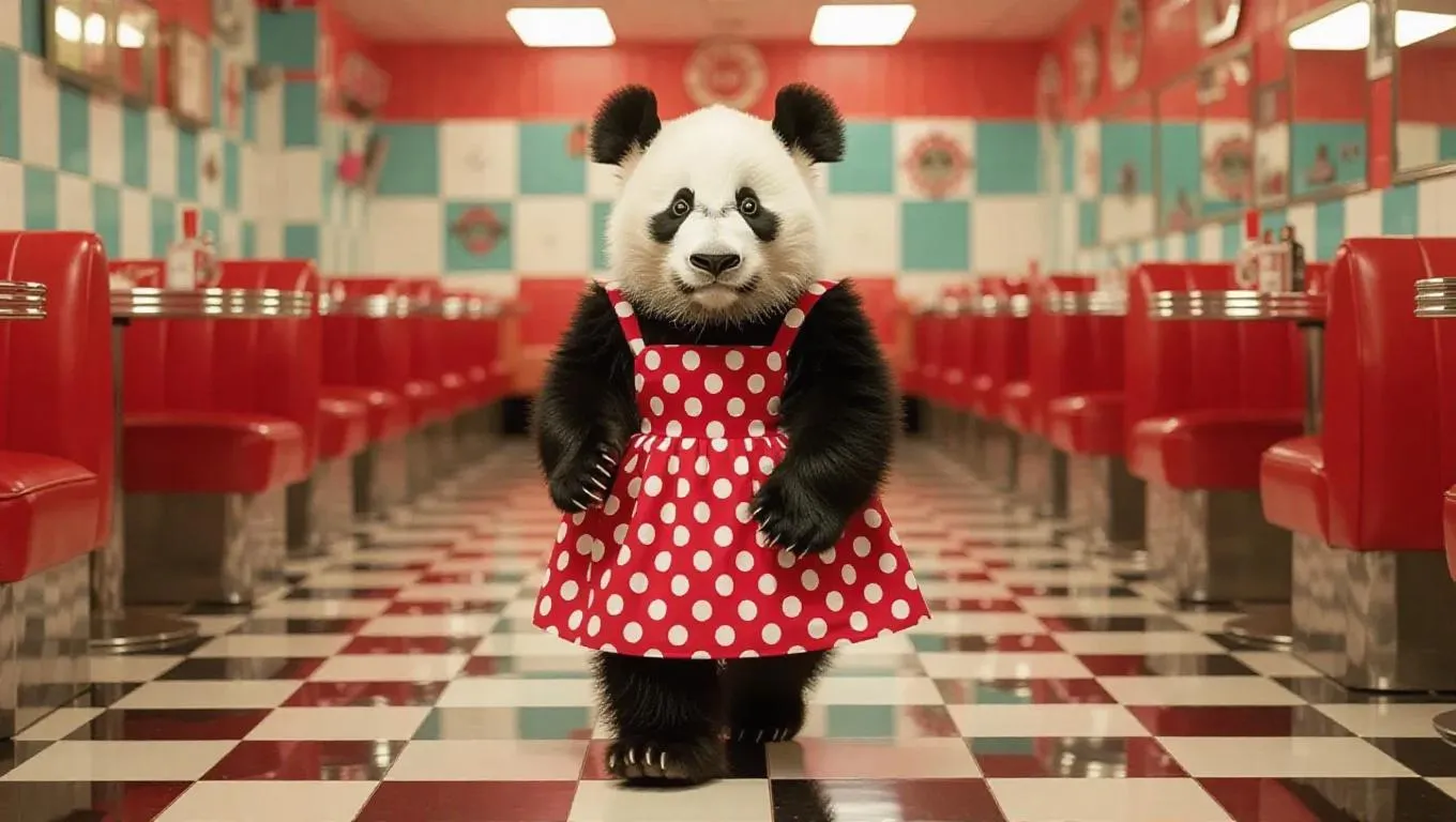 A vintage panda strolls down a retro runway, radiating nostalgia and charm. It dons a classic polka dot dress with a fitted waist. The background is a 1950s diner filled with checkerboard patterns, creating a cheerful atmosphere.