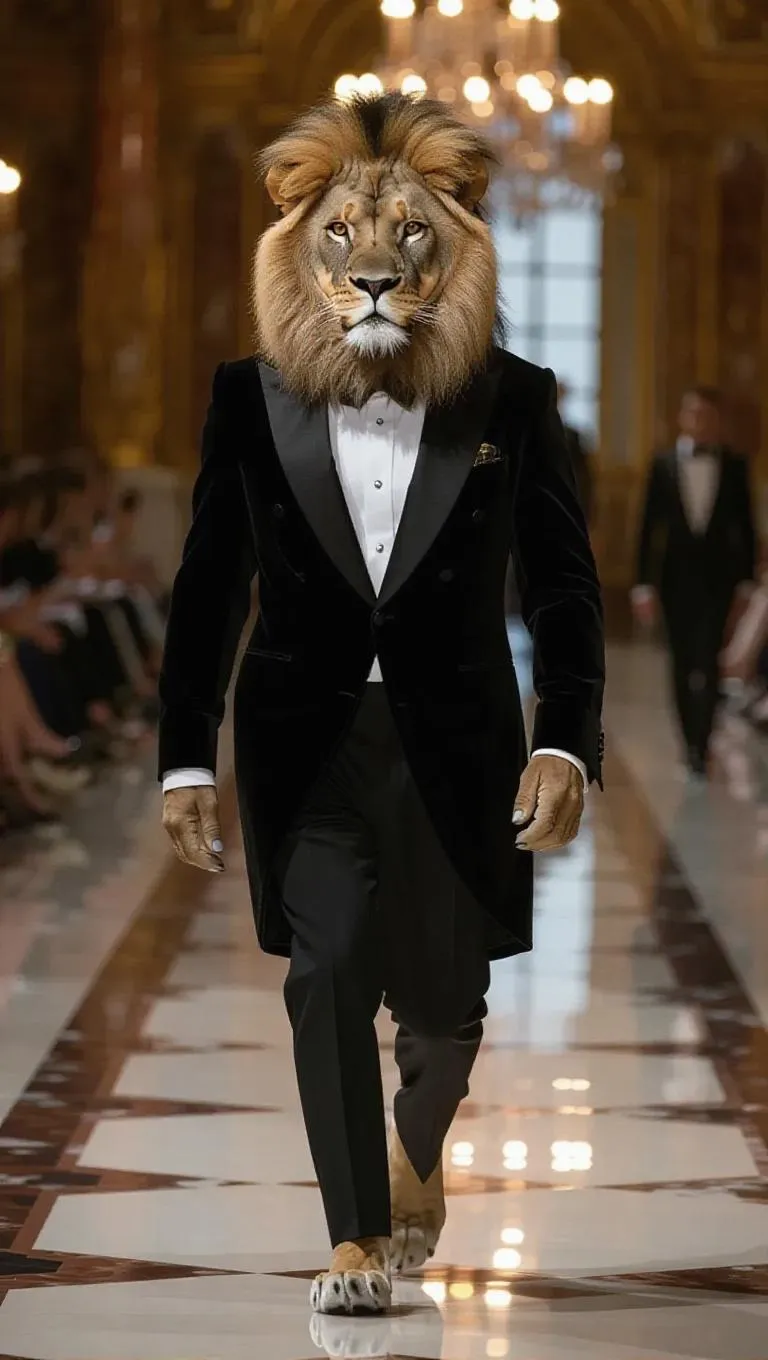 The chic lion, attired in a tailored tuxedo with velvet lapels, marches proudly down the runway with a confident gaze. The camera zooms in on its dignified posture, highlighting the suit's sharp lines and the lion's flowing mane. The background is a grand ballroom, exuding an air of luxury and elegance.