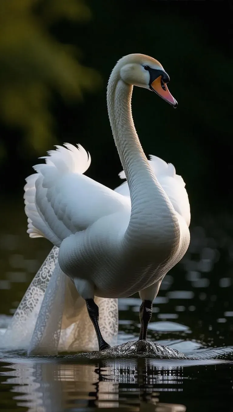 The elegant swan, enveloped in a delicate lace gown with intricate detailing, glides effortlessly down the runway with a tranquil demeanor. The camera captures its poised movements, showcasing the gown's elegance and the swan's graceful neck. The background features a tranquil lake, enhancing the serene mood of the scene.