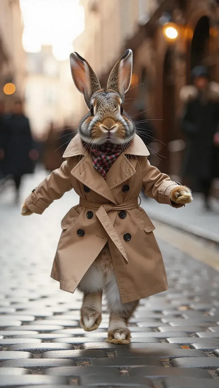 The sophisticated rabbit, dressed in a classic trench coat with a stylish scarf, hops down the runway with an air of sophistication. The camera catches its energetic jumps, emphasizing the trench coat's flow and the rabbit's long ears. The background is a charming old-town street, adding a quaint touch to the scene.