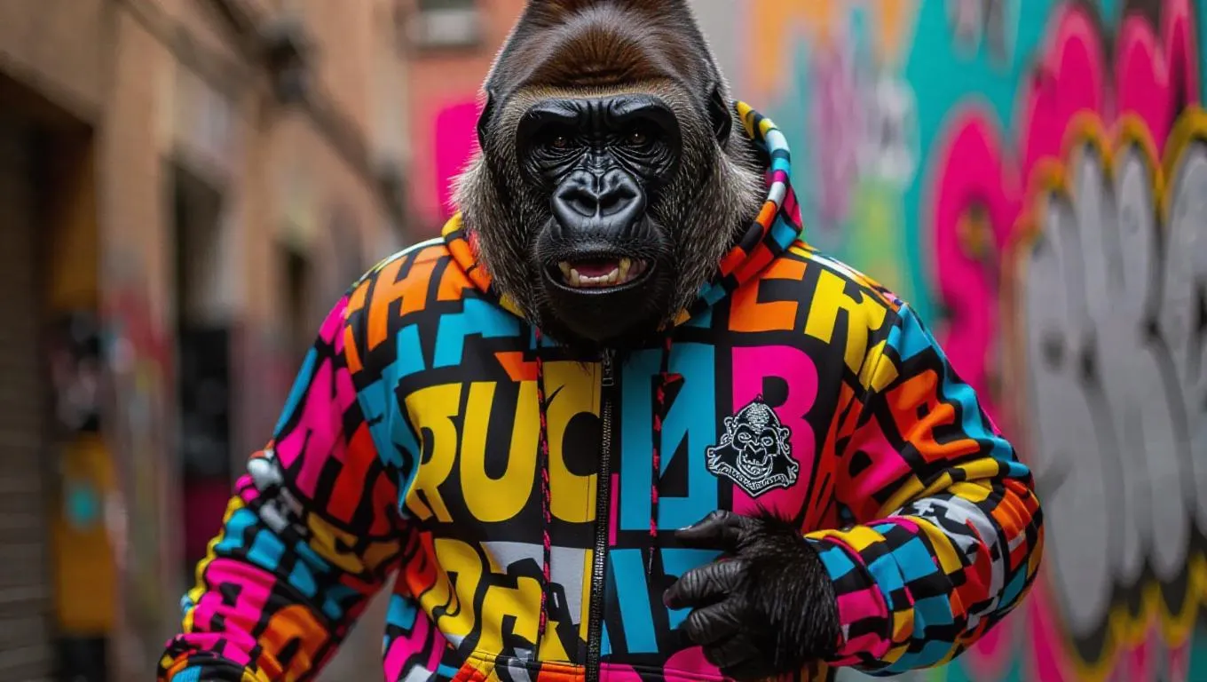 The trendy gorilla, dressed in a vibrant graphic hoodie with bold prints, moves confidently down the runway with a playful grin. The camera captures its powerful strides, showcasing the hoodie and the gorilla's muscular frame. The background is a lively urban setting, filled with street art and energy.