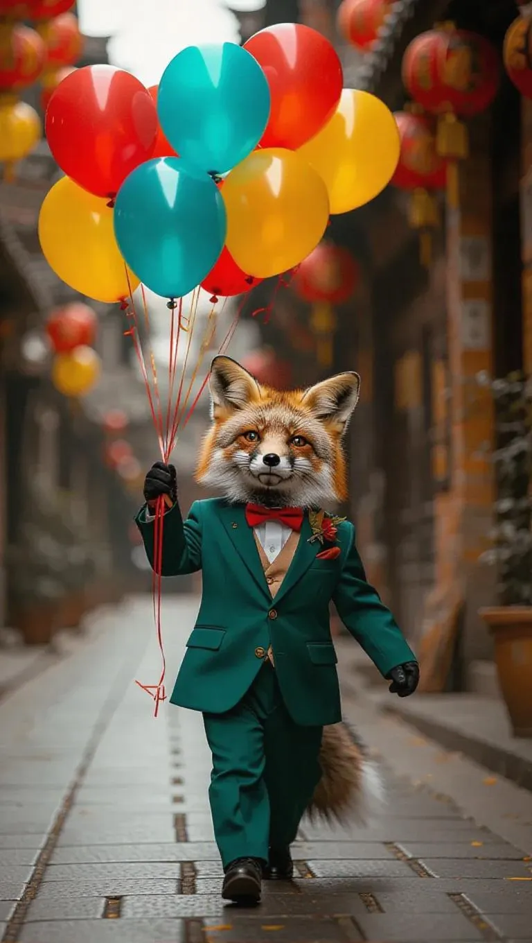 A cheerful T 台 scene featuring a cute fox strutting boldly in a tailored emerald green suit, holding a bouquet of colorful balloons in red, teal, and yellow, floating playfully above him, creating a whimsical and vibrant atmosphere.