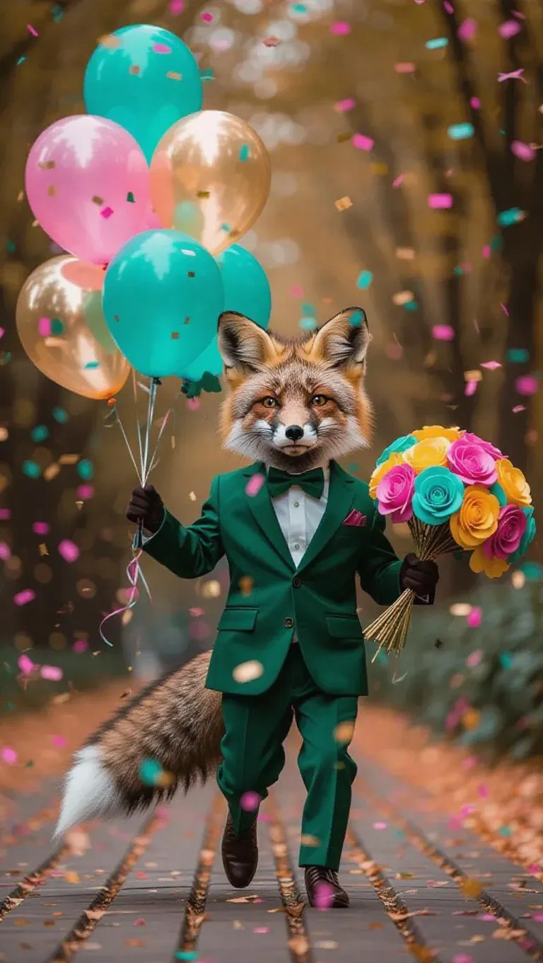A cheerful T 台 scene featuring a cute fox strutting boldly in a tailored emerald green suit, holding a bouquet of colorful balloons in pink, teal, and gold, with sparkling confetti falling around him, creating a whimsical and vibrant atmosphere.