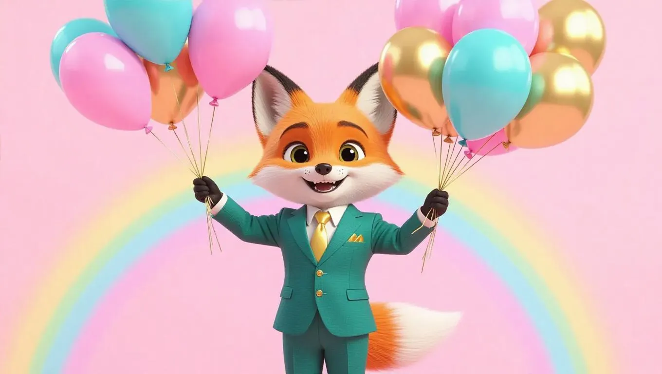 A cheerful T 台 scene featuring a cute fox strutting boldly in a tailored emerald green suit, holding a bouquet of colorful balloons in pink, teal, and gold, with a rainbow in the background, creating a whimsical and vibrant atmosphere.