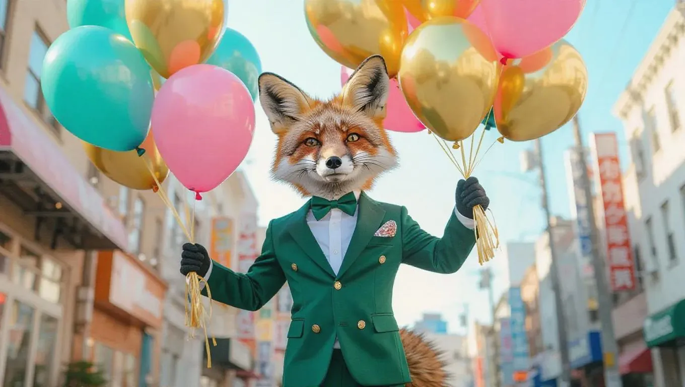 A cheerful T 台 scene featuring a cute fox strutting boldly in a tailored emerald green suit, holding a bouquet of colorful balloons in pink, teal, and gold, on a sunny day, creating a whimsical and vibrant atmosphere.