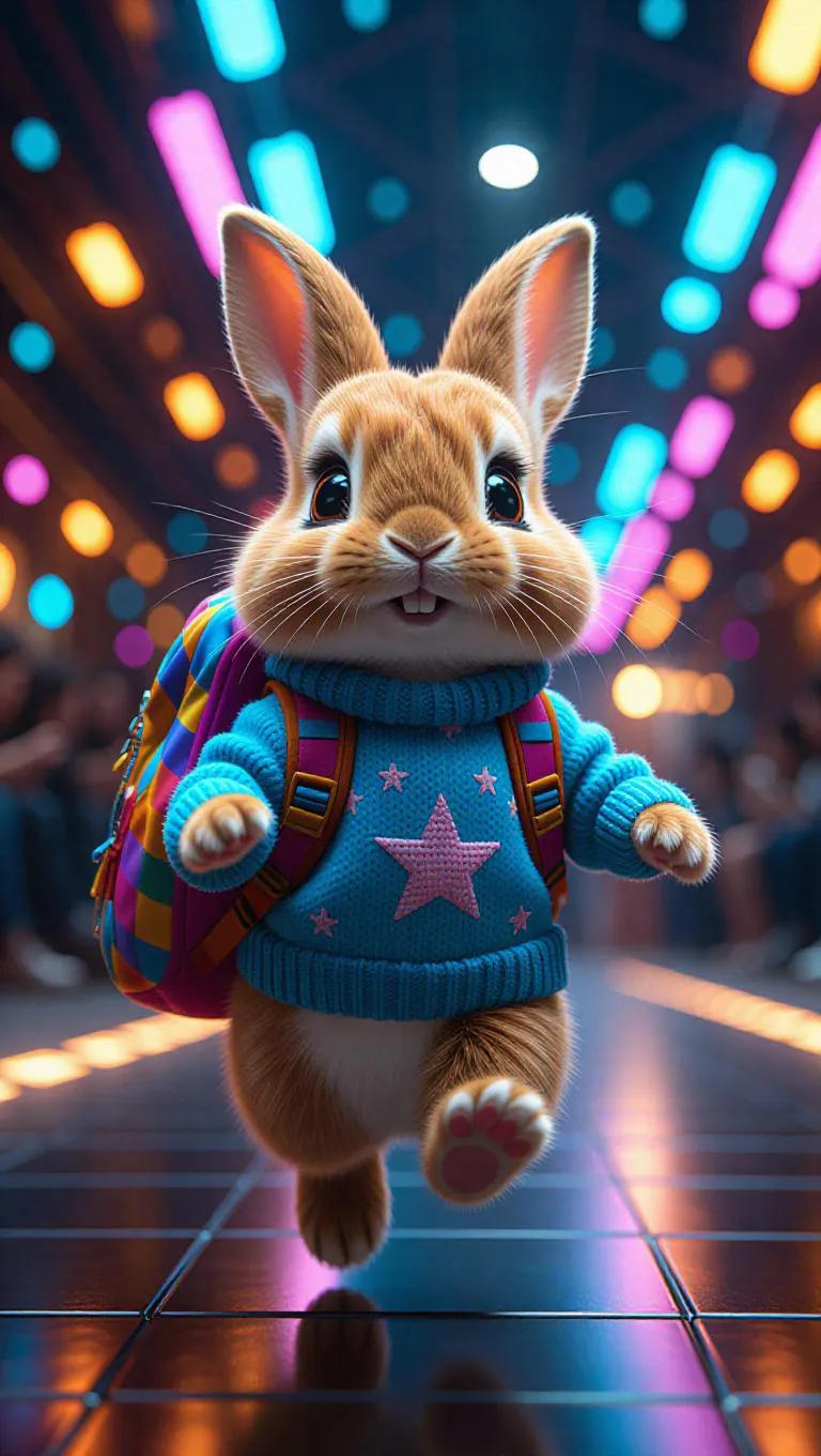 The fluffy rabbit, wearing a cozy blue sweater with star motifs and carrying a colorful backpack, hops down the runway with a joyful expression. The camera follows its energetic hops, capturing the movement of the sweater and the bunny's ears. The background remains a vibrant, futuristic runway, highlighting the rabbit's charming and playful.