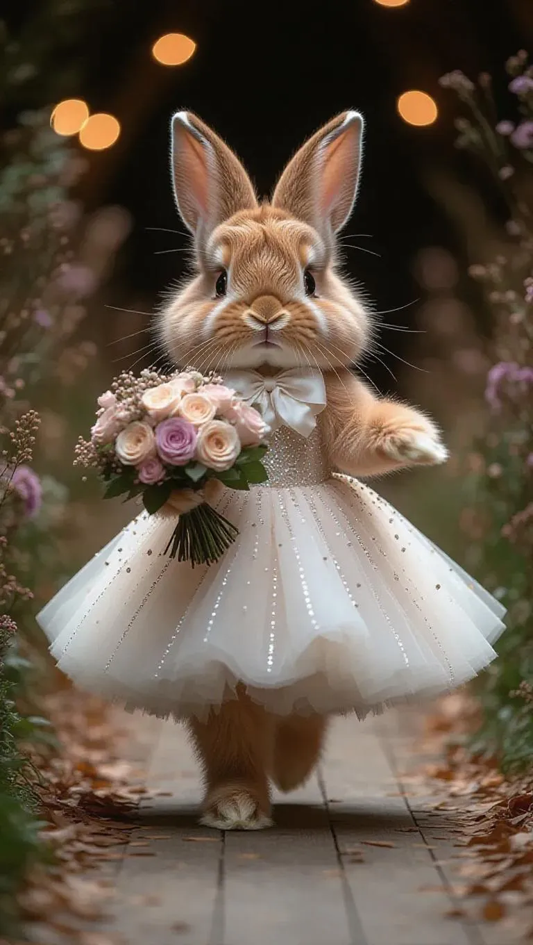 The fluffy rabbit, wearing a delicate white gown with sequins and carrying a floating bouquet, hops down the runway with a dreamy look. The camera follows its gentle hops, capturing the movement of the gown and the bunny's ears. The background remains a whimsical, enchanted runway, highlighting the rabbit's ethereal and magical.