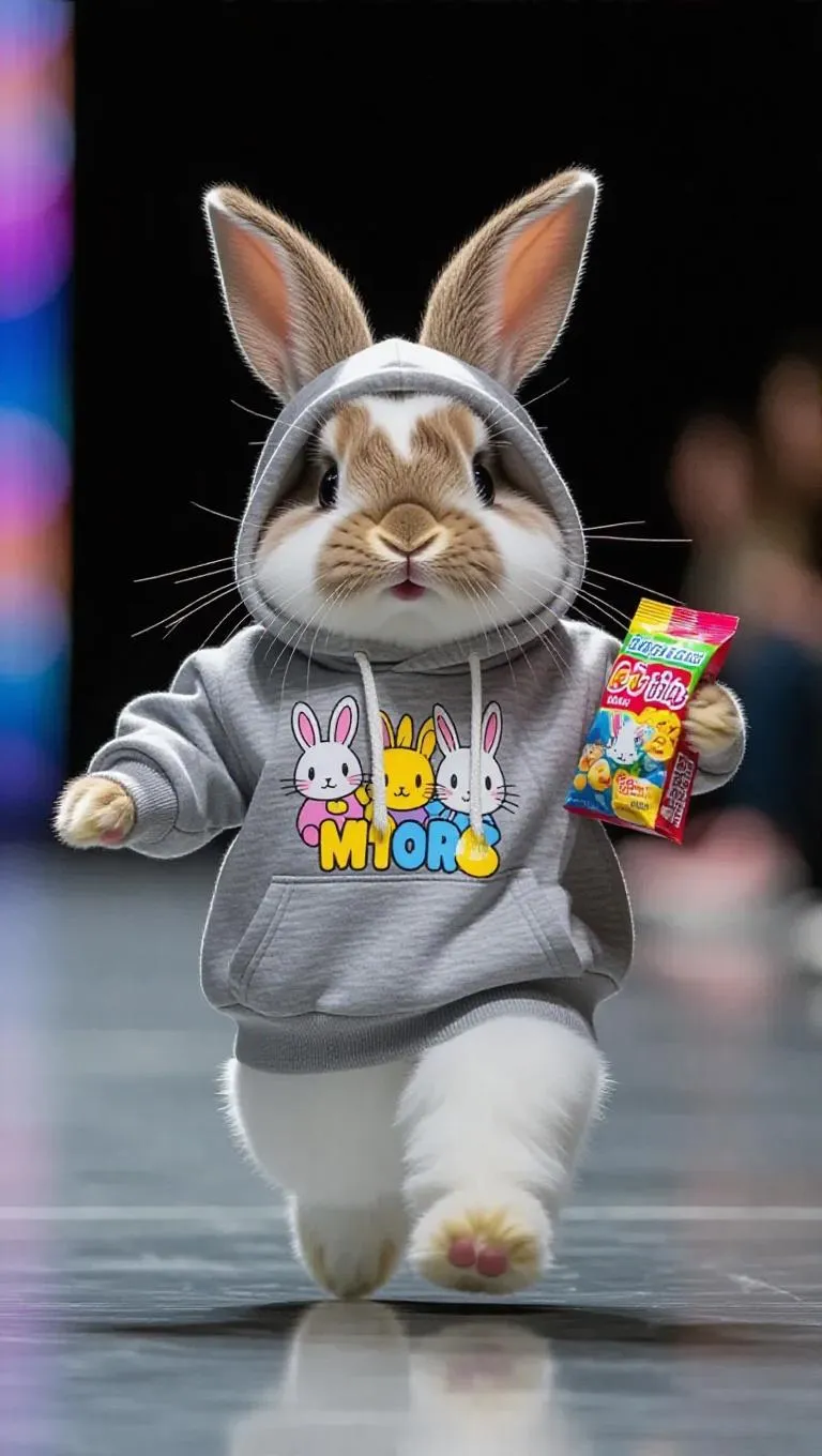 The fluffy rabbit, wearing a bulky grey hoodie with cartoon characters and carrying a snack bag, hops down the runway with an animated expression. The camera follows its playful hops, capturing the movement of the hoodie and the bunny's ears. The background remains a casual, playful runway, highlighting the rabbit's fun and approachable.