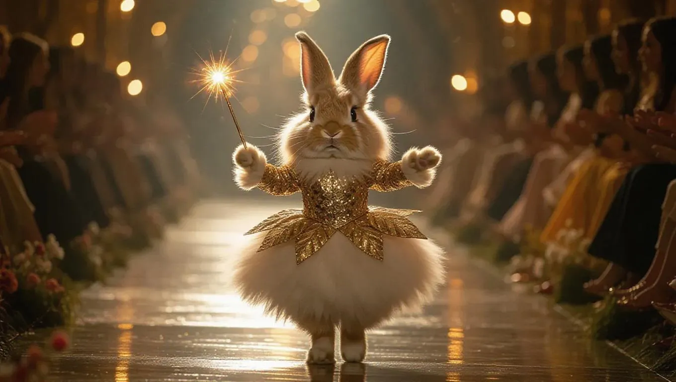 The fluffy rabbit, wearing a sparkling gold outfit with feathers and carrying a magic wand, hops down the runway with an enchanting gaze. The camera follows its whimsical hops, capturing the movement of the outfit and the bunny's ears. The background remains a mystical, fairy-tale runway, highlighting the rabbit's magical and otherworldly.