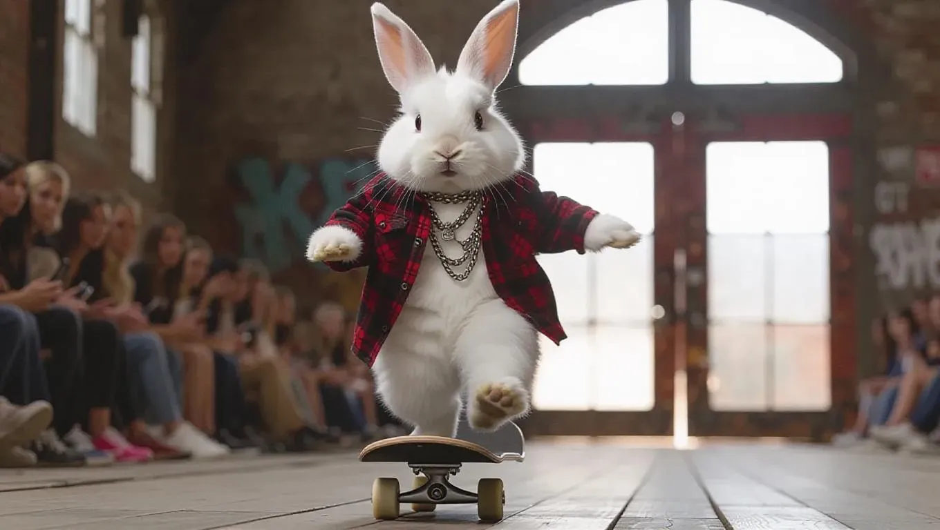 The fluffy rabbit, wearing a rebellious plaid shirt with chains and carrying a skateboard, hops down the runway with a rebellious grin. The camera follows its bold hops, capturing the movement of the shirt and the bunny's ears. The background remains a gritty, urban runway, highlighting the rabbit's edgy and fearless.