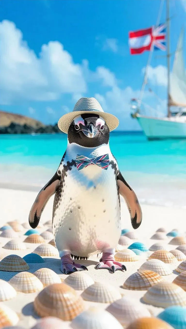 A curious penguin waddles on the sandy beaches of the Galápagos Islands, Ecuador, its fluffy feathers shimmering in the sunlight. The penguin sports a tiny bow tie and a beach hat, its eyes sparkling with mischief. Surrounding it, colorful shells and azure waters create a vibrant contrast. In the distance, a yacht glides across the horizon, its flag fluttering in the wind. The air is filled with the sounds of gentle waves and the distant calls of seagulls.