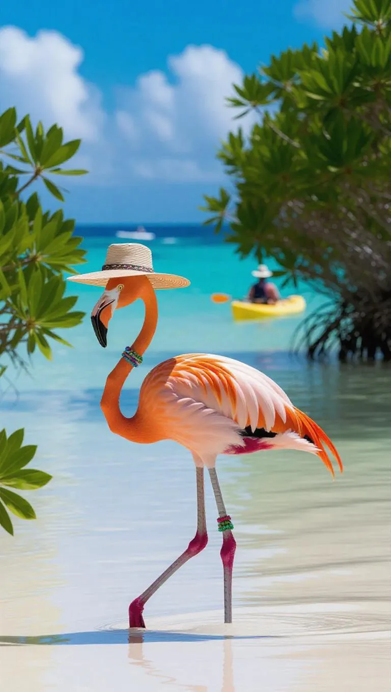 A charming flamingo wades in the shallow lagoons of the Galápagos Islands, Ecuador, its feathers bright against the sun. The flamingo wears a bead necklace and an oversized sun hat, its long legs gracefully poised. Surrounding it, lush green mangroves and sparkling blue waters enhance the beauty of the scene. In the distance, a small kayak paddles along the horizon, its rider enjoying the tranquility. The air is filled with the sounds of soft waves and the calls of tropical birds.