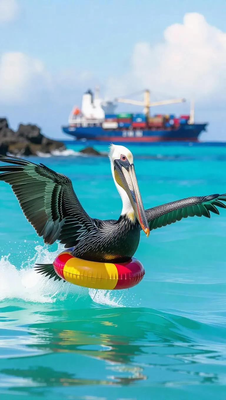 A cheerful pelican dives into the turquoise waters of the Galápagos Islands, Ecuador, its wings spread wide under the sun. The pelican sports a funky visor and a colorful float, its beak aiming for fish. Nearby, rocky shores and azure waters create a stunning view. In the distance, a cargo ship sails steadily across the horizon, its crew busy at work. The air is filled with the sounds of splashing water and the distant horn of the ship.