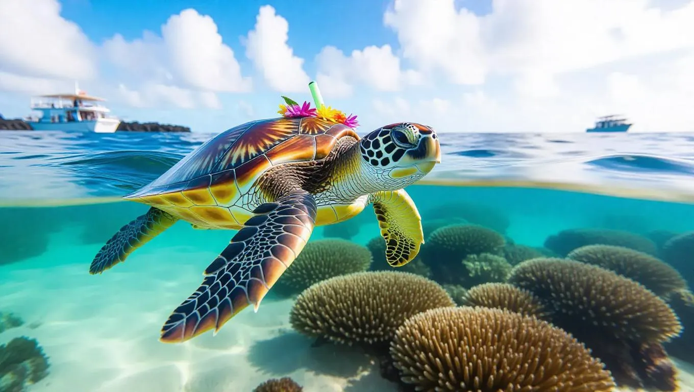 A lively sea turtle glides effortlessly through the warm waters of the Galápagos Islands, Ecuador, its shell shimmering under the sun. The turtle is adorned with a colorful lei and a small snorkel, its demeanor relaxed and peaceful. Surrounding it, vibrant coral reefs and golden sands create a beautiful underwater landscape. In the distance, a diving boat floats above the horizon, its divers exploring the depths below. The air is filled with the sounds of bubbling water and the calls of marine life.