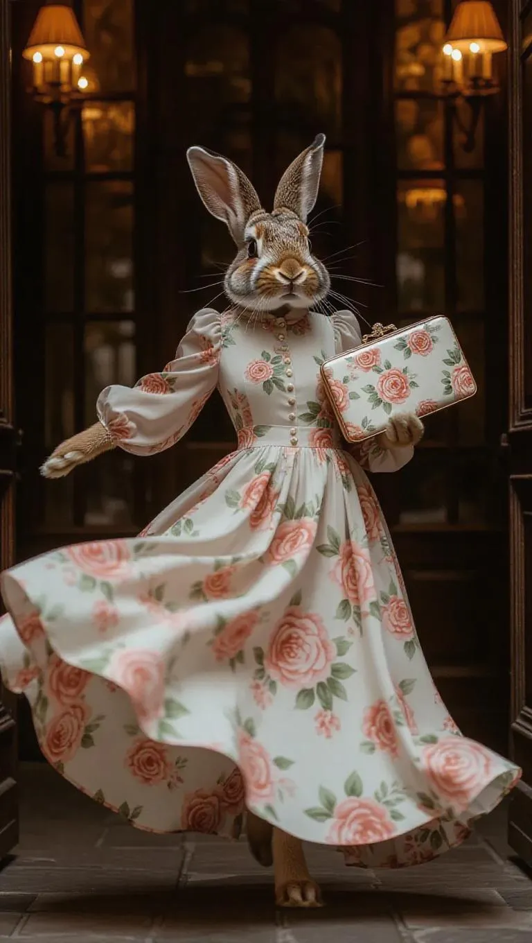 A cheerful T 台 scene featuring a playful rabbit gliding gracefully in a flowing floral maxi dress, holding a vintage-inspired clutch, creating a romantic and elegant atmosphere.