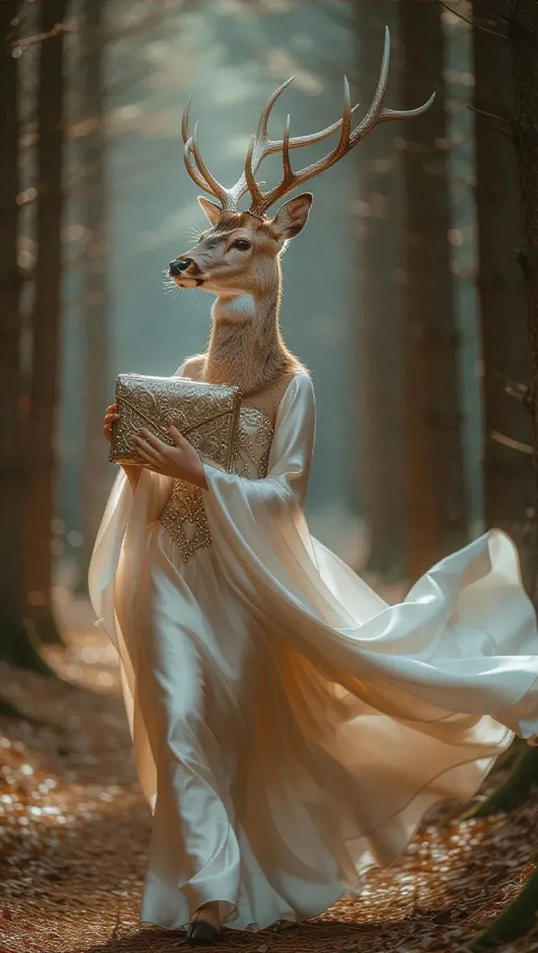 A cheerful T 台 scene featuring an elegant deer gliding gracefully in a flowing silk gown, holding a metallic clutch, creating a romantic and dreamy atmosphere.
