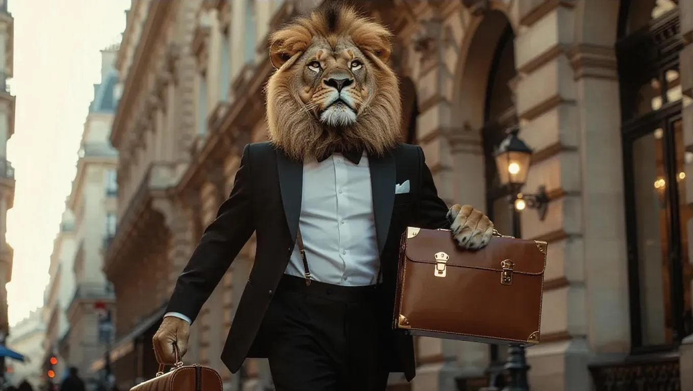 A cheerful T 台 scene featuring a dapper lion gliding gracefully in a tuxedo jacket, holding a classy briefcase, creating a formal and elegant atmosphere.