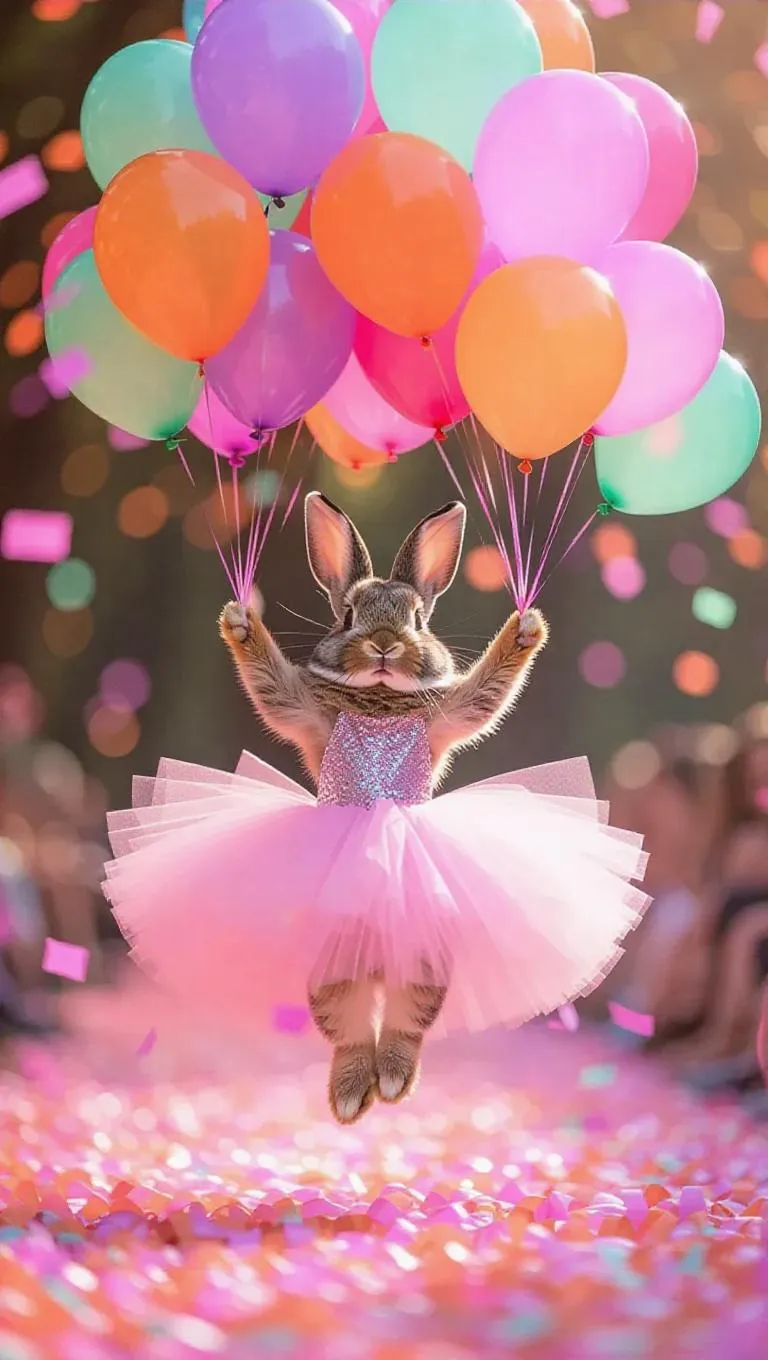 A cheerful runway scene featuring a cute bunny gliding gracefully in a pastel pink tulle dress, holding a bouquet of colorful balloons in purple, green, and orange, floating playfully above her, surrounded by a sea of soft, fluttering ribbons, creating a whimsical and vibrant atmosphere.