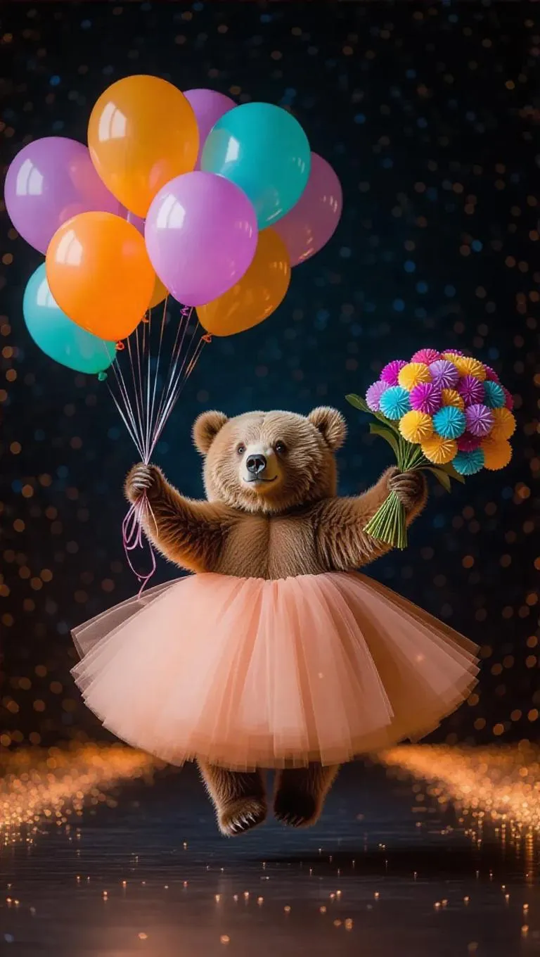 A cheerful runway scene featuring a charming bear gliding gracefully in a soft peach tulle dress, holding a bouquet of colorful balloons in turquoise, lilac, and orange, floating playfully above her, surrounded by a sea of dazzling stars, creating a whimsical and vibrant atmosphere.
