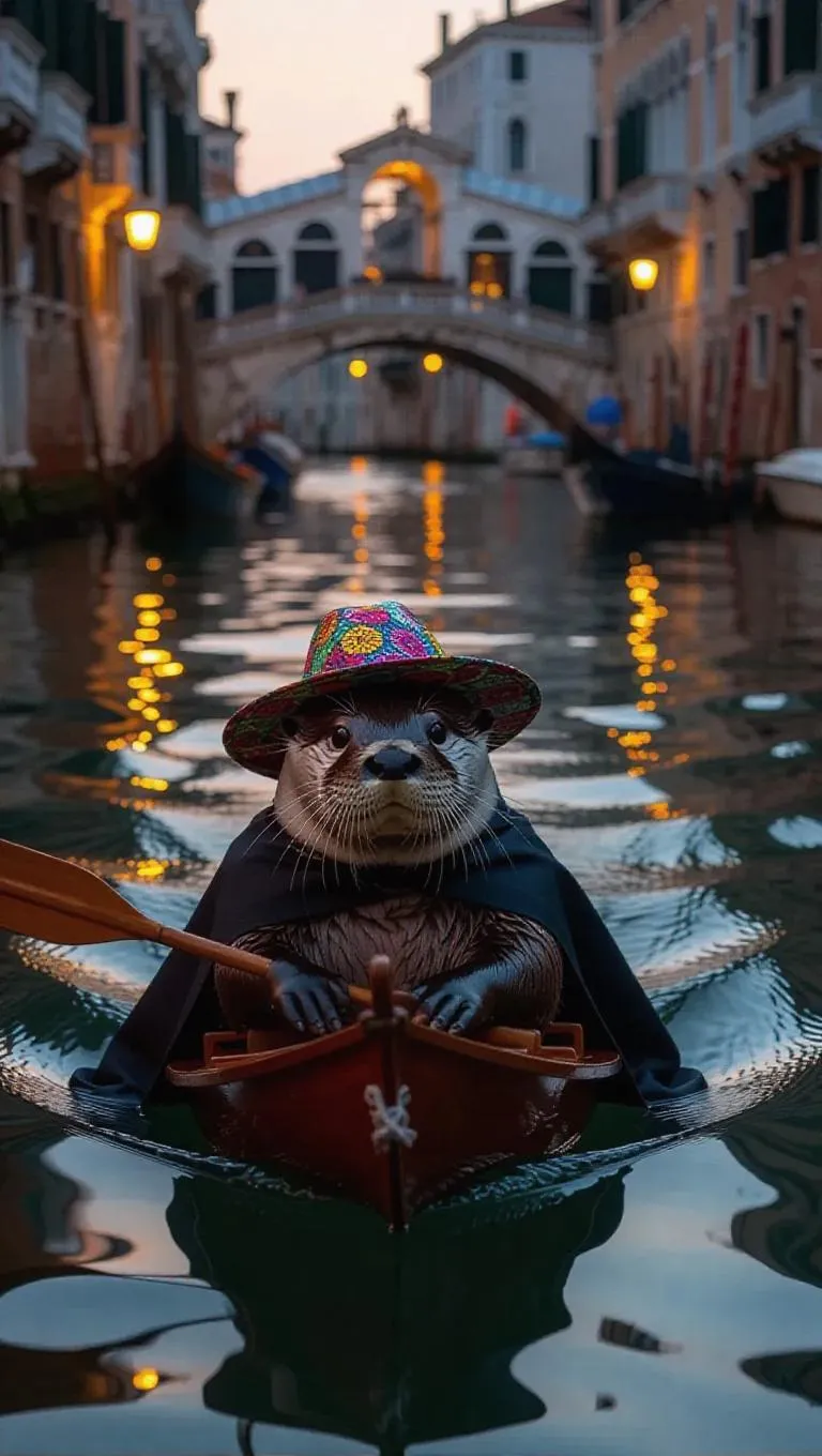 An adventurous otter paddles across the canals of Venice, Italy, clutching a small painted paddle in its paws. The otter is dressed in a vibrant sunhat and a flowing cape, its sleek body maneuvering expertly through the water. Around it, elaborate structures and majestic bridges border the canals, their reflections glinting in the light. In the distance, a large yacht glides past, its bright lights illuminating the evening. The atmosphere is alive with melodies and the soft whisper of water against the hulls of boats.